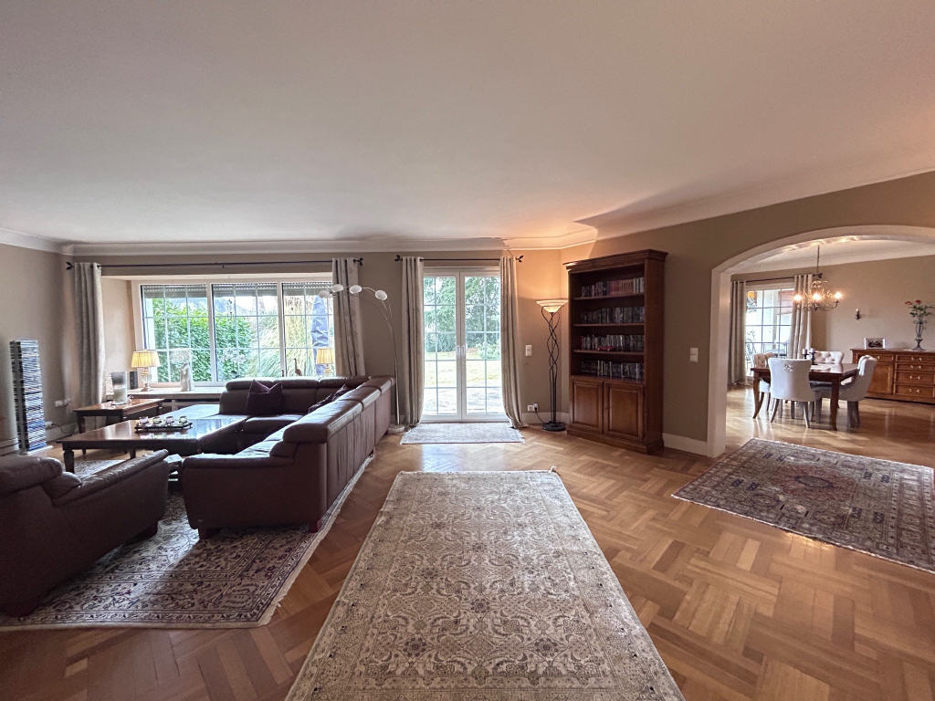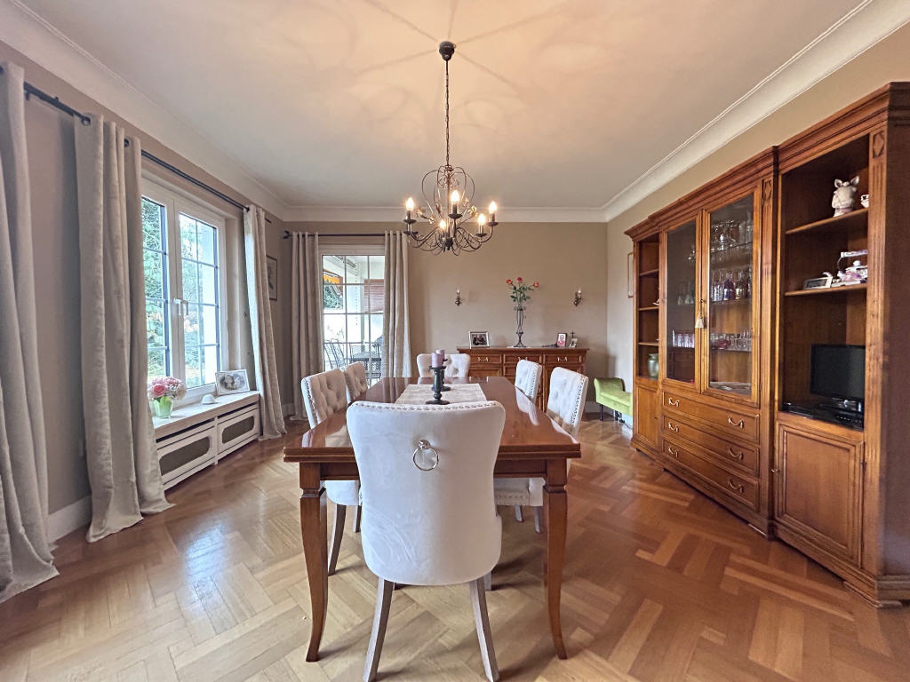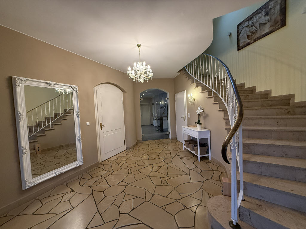 Exklusive Doppelhaushälfte mit großzügigem Grundstück und vielseitiger Nutzfläche (WEG geteilt). Diese außergewöhnliche Doppelhaushälfte vereint exklusives Wohnen mit beeindruckendem Raumangebot und vielseitigen Nutzungsmöglichkeiten. Auf einem weitläufigen Grundstück von ca. 1.550 m² bietet die Immobilie ein hohes Maß an Privatsphäre, Komfort und Flexibilität. Die Wohnfläche von ca. 390 m² überzeugt durch eine großzügige Raumaufteilung, helle Wohnbereiche und eine hochwertige Ausstattungsqualität. Große Fensterflächen sorgen für eine angenehme Lichtdurchflutung und schaffen ein offenes, repräsentatives Wohnambiente. Ergänzt wird das Raumangebot durch ca. 48 m² Nutzfläche, die sich ideal für gewerbliche, hobbybezogene oder lagertechnische Zwecke eignet. Ein besonderes Highlight stellt der vorhandene Kühlraum dar, welcher vielfältige Nutzungsmöglichkeiten eröffnet und diese Immobilie zu einer echten Rarität macht. Das großzügige Grundstück eröffnet zahlreiche Gestaltungsoptionen sei es für einen exklusiven Garten, weitläufige Freizeitflächen oder individuelle Konzepte. Die Kombination aus repräsentativem Wohnen und funktionaler Zusatzfläche macht dieses Objekt besonders attraktiv für anspruchsvolle Eigennutzer, Familien oder Selbstständige. Im Zuge einer Modernisierung wird eine neue, leistungsstarke Wärmepumpe installiert. Zusätzlich erfolgt die Installation einer neuen Photovoltaikanlage mit ca. 30 kW Leistung sowie einem 22 kW Speicher. Diese zukunftsweisende Energiekonzeption ermöglicht ein nahezu autarkes Wohnen und sorgt für äußerst geringe laufende Nebenkosten von lediglich ca. 200 EUR pro Monat Zusätzlich ist ein Stromgenerator vorhanden, der eine zuverlässige Energieversorgung auch in besonderen Situationen gewährleistet Ausstattung: Massive Bauweise mit Stahlbetondecken und Porotonstein Walmdach mit Gauben und Eindeckung aus Naturschiefer Kunststofffenster 3-fach-verglast aus 2016 und 2021 Alufenster mit Isolierglas im Untergeschoss Natursteinböden Vollholzdielenböden im Wohn- und Essbereich Holztüren im Wohnbereich Whirlpool-Badezimmer im Dachgeschoss Klimageräte in den Schlafzimmern im Dachgeschoss 1 offener Kamine (auf der Terrasse) Photovoltaik-Anlage (2026) Blockheizkraftwerk, Gasspitzenlastkessel, Öl-Zentralheizung